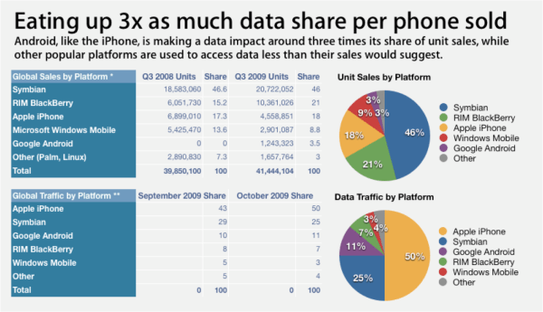 Hoje, somente o sistema operacional, iPhone OS com cerca de 18% de share entre os devices, representa cerca de 50% do tráfego de internet móvel mundial. Outro fato interessante é que a chegada do Android tem aumentado ainda mais a velocidade de crescimento da internet móvel, com um multiplicador ainda maior que o do iPhone. Aparecem em destaque nessa lista, também com forte crescimento, os outros MIDs sem telefone incorporado como o iPod Touch (contabilizado no share do iPhoneOS) , Sony PSP e Nintendo DSi.Outra pesquisa, também da Admob, realizada com desenvolvedores indica uma forte preferência nos futuros desenvolvimentos para as plataformas de iPhone e Android. Veja a seguir os dois estudos completos da Admob que subi na Slideshare: