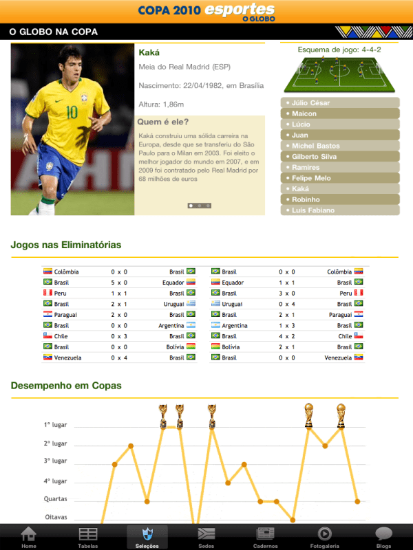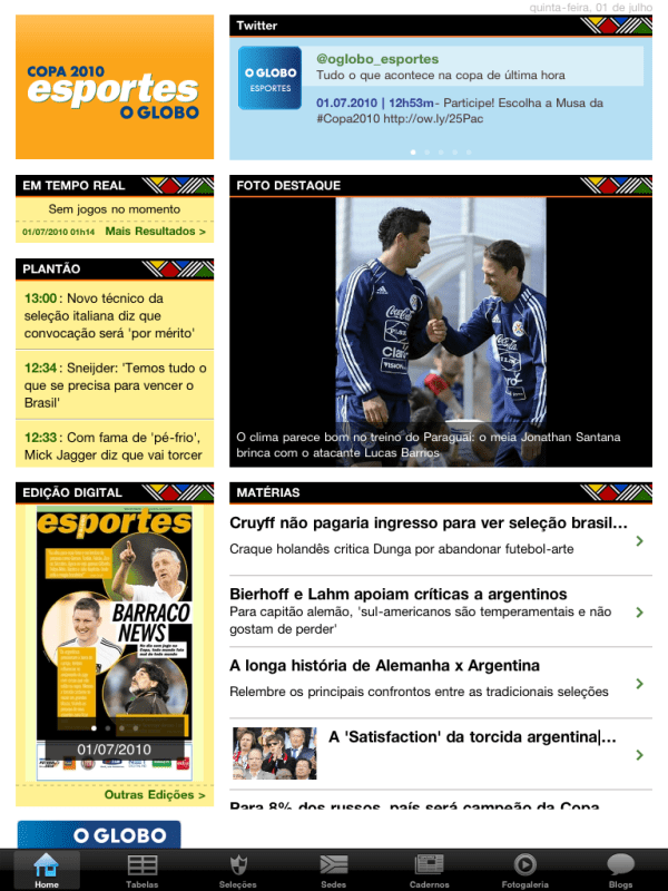 O jornal O Globo esperou para lançar seu primeiro iPad app na Copa com foco em esportes, além de notícias, fotos e tabelas, traz um histórico das seleções, bem legal, e dá acesso ao caderno de Esportes do Jornal, acredito que por tempo limitado, grátis para baixar.
