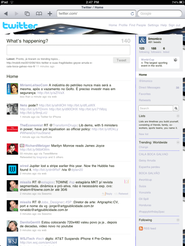 Os brasileiros, parece que gostaram da brincadeira e mais uma vez colocam suas piadas nos trending topics do Twitter. Hoje além do CALA BOCA GALVÃO que virou notícia até no The New York Times, Geyse Arruda aparece devido a um suposto livro que irá publicar, mas que para a piada internacional vira uma baleia rosa em extinção, ou mesmo a verdadeira culpada pelas baleiadas do Twitter. Daqui a pouco veremos provavelmente vídeos no YouTube e panfletos ecológicos, como vimos no caso do Galvão. Claramente a galera escolada com o Orkut em criar visibilidade online multiplicando posts aprendeu como aparecer no Twitter. Nesse momento pelo menos 4 dos tópicos são brasileiros.