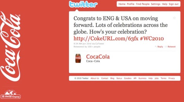 As marcas começam a testar suas ações no Twitter e medir os primeiros resultados. Na semana passada tinha sido o filme Toy Story3 a estrear o o formato promocional nos trending topics do Twitter. Esta semana foi a vez da Coca-Cola fazendo o TT #WC2010.