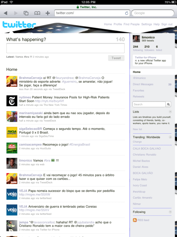 A Copa do Mundo tem se provado o ambiente ideal para esses experimentos, mas vemos também que com os movimentos tipo CALA BOCA GALVAO e seus derivados, marcas e forças como a Rede Globo também estão começando a tentar entender (ou não?) como pilotar sua credibilidade dentro das redes sociais. Hoje, por exemplo durante o jogo do Brasil, os 10 trending topics mundiais chegaram a ficar 100% brasileiros (foto abaixo mostra um momento com 7/10), um verdadeiro hostile take-over do Twitter por brasileiros. De forma natural, ou manipulada, é isso que vem acontecendo fortemente no Twitter nas últimas duas semanas. Uma grande oportunidade, mas também um grande desafio para as marcas explorarem essas águas.