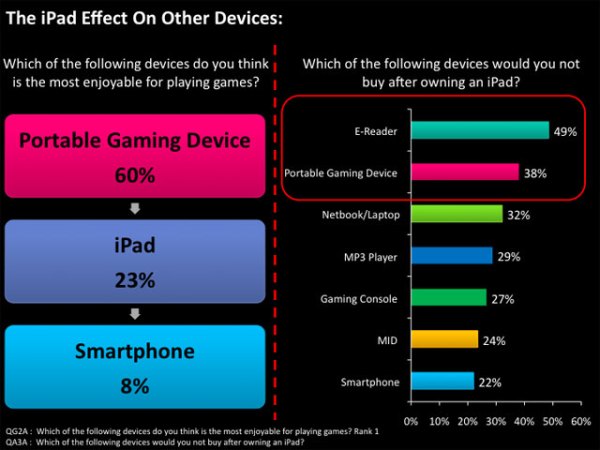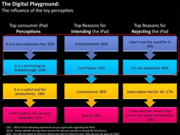 Pesquisa recente da Resolve Market Research divulgada pela Mashable, mostra as primeiras vocações do iPad no mercado. Enquanto não causa nenhuma surpresa ao indicar uma forte substituição aos e-readers, mostra também seu potencial como plataforma de games. Outra interessante conclusão, o iPad é o primeiro produto da Apple para 37% da base pesquisada. A pesquisa também mostra a vocação para entretenimento como principal intenção de compra e o preço entre as principais barreiras.