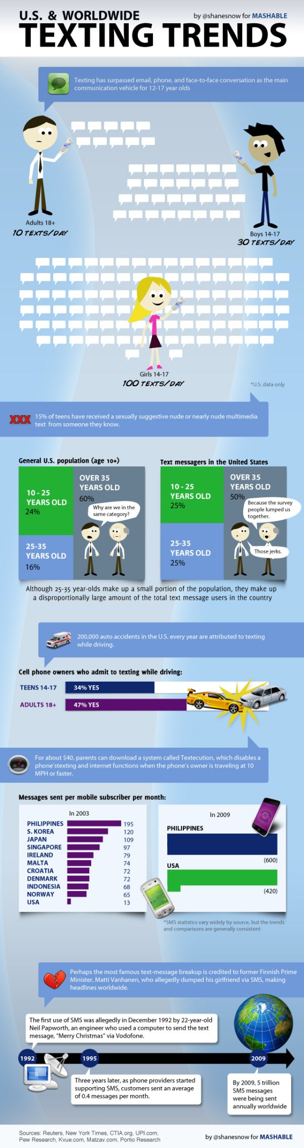 Curiosidade: O crescimento dos SMS no Brasil continua ínfimo comparado com a lista de países no infográfico. Temos hoje no Brasil número menor (11) de mensagens por usuário que os EUA tinham em 2003, como último na tabela mostrada no infográfico. Isso devido ao preço das mensagens SMS no Brasil, um dos mais caros no mundo. Lembro que no lançamento da Oi há 8 anos, o valor do SMS foi colocado em R$0,31 para ecoar o código de DDD 31 da Telemar, assim como a promoção de chamadas grátis no fim de semana por 31 anos, dos pioneiros da oferta pré-lançamento da Oi. Pois bem, confira agora os preços de SMS da sua operadora e veja que em 8 anos com suposta competição,o preço dos torpedos avulsos continuam nessa faixa de R$0,31, ou seja, pelo menos 10 vezes mais que a maioria dos países que efetivamente desenvolveram esse negócio e utilizam melhor a capacidade instalada de suas redes. Qual o receio, então das operadoras? … Que os torpedos venham substituir as chamadas de voz como é o caso das Filipinas. O fato é que nas Filipinas, o que falta são telefones fixos …