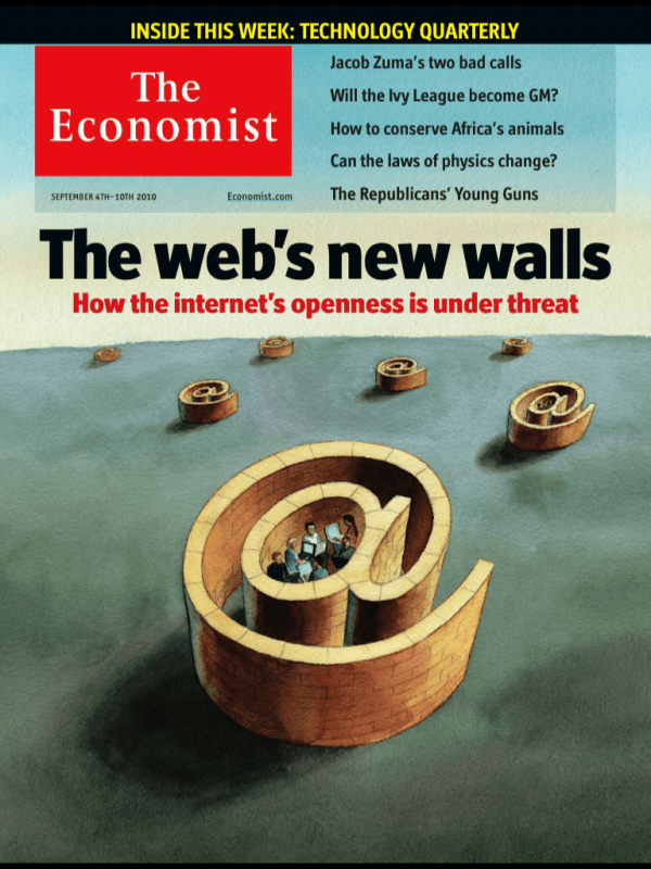 A matéria da capa da revista The Economist de hoje destaca os novos muros, paredes, muralhas que estão sendo colocadas na web e a ameaça que ela coloca aos princípios de abertura e igualdade que a caracterizaram até agora e determinaram seu sucesso e crescimento. O texto diz que essas divisões estão surgindo em 3 frentes: