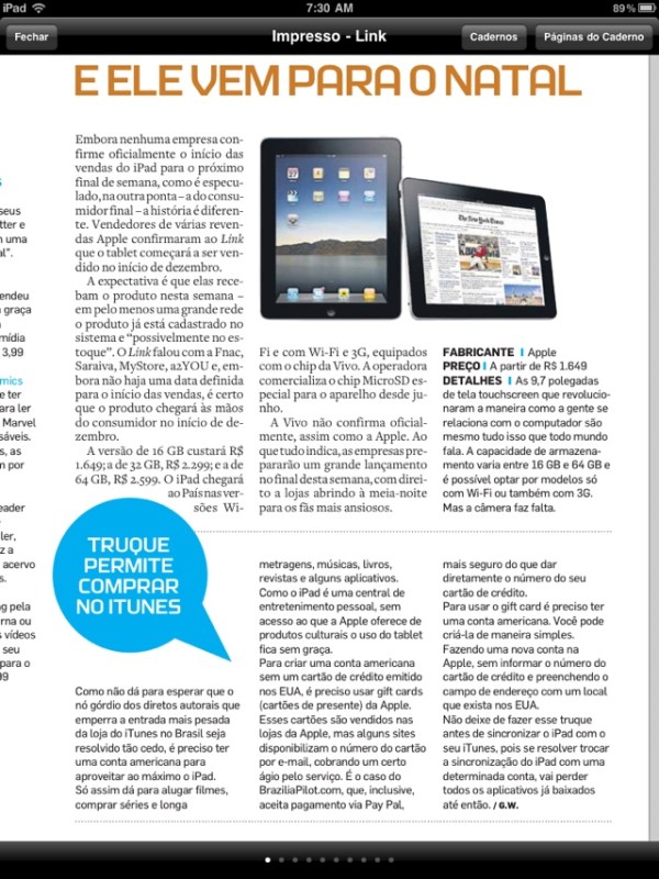 Foram oito meses de ansiedade e espera, mas tudo indica que o iPad realmente esteja desembarcando no Brasil neste fim de semana, nos primeiros dias de dezembro (confirmado no site da Apple para 3 de Dezembro). Segundo o caderno Link do Estadão (imagem acima), os varejistas não confirmam, mas estão engatilhados para o lançamento.