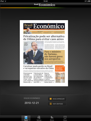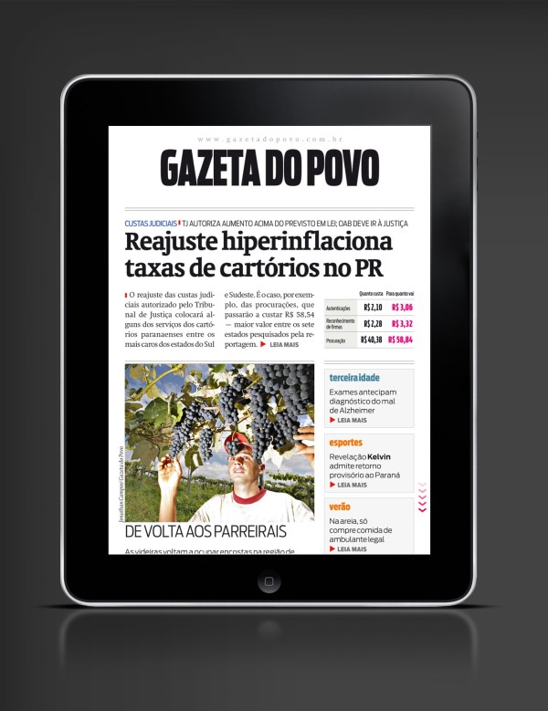 Nas últimas semanas, uma série de jornais como o Estado de Minas, Zero Hora, Correio Braziliense, Brasil Econômico (foto acima) vieram se juntar ao Estadão, O Globo e Folha, oferecendo suas versões para o iPad. Na semana que vem, dia 17, a Gazeta do Povo do Paraná deve se juntar ao time, segundo nos informou a assessoria de imprensa (foto abaixo). Surpresa para mim tem sido o Jornal Valor Econômico, ainda não ter se posicionado no iPad, pois com uma circulação de cerca de 50 mil exemplares, claramente está perdendo uma oportunidade de no mínimo expandir geograficamente, ou mesmo de defender sua base de clientes.