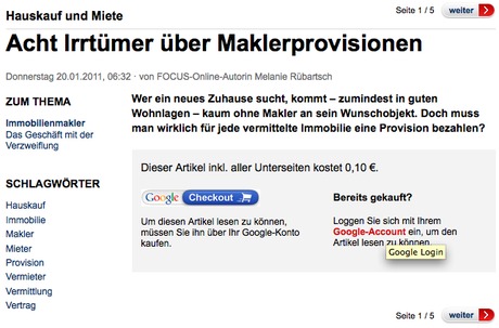 A idéia não é nova, muito menos o problema. Na busca incansável que as empresas de notícias e jornalismo tem em recuperar ou criar um modelo de negócios online, o portal de notícias Focus Online se junta ao Google com seu braço de pagamentos, Google Checkout, e começa a pilotar o modelo de micro-pagamentos por notícia avulsa.