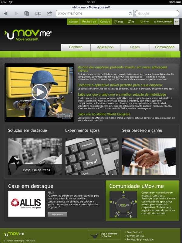 Hoje gostaria de destacar dois exemplos interessantes de players entrando nesse mundo de forma inovadora. O primeiro, uMov.me (foto acima), um recém lançado desenvolvimento da Trevisan Tecnologia, que propõe um portfolio de aplicativos de prateleira a preços razoáveis, já desenhado para uma série de atividades e funções corporativas, como captação de imóveis para corretores, transporte de mercadorias, visitas de técnicos de TV a cabo, e muitas mais. A proposta parece ser excelente para pequenas e médias empresas, quem não comportariam o desenvolvimento de aplicativos proprietários. Todas os aplicativos estão disponíveis para teste gratuitamente em self-service no site, limitados a um usuário para a empresa. No próprio site pode escolher os planos, que tem suas mensalidades definidas por número de usuários.