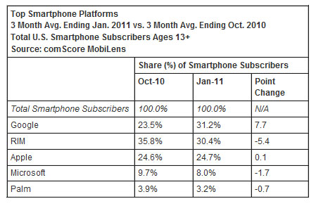 O Android acaba de ultrapassar a platforma Blackberry para smartphones nos EUA, segundo dados da comScore, indicando que o ano de 2011 pode sim ser o ano do Android no mundo mobile, ou pelo menos dos smartphones. A briga fica cada vez mais interessante para os usuários, com uma forte opção de plataforma aberta emergindo para múltiplos hardwares. Resta saber se o mesmo acontecerá para o mundo dos tablets no médio prazo ???