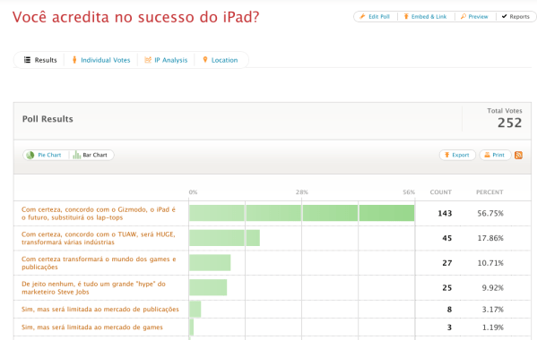 Encerramos a enquete sobre o sucesso do iPad. Claro que com 15 milhões vendidos em 2010, a enquete já estava para lá de obsoleta, mas a resposta dominante indica uma forte crença que os tablets substituirão os lap-tops e serão agentes catalizadores de transformação em várias indústrias. Certo que alguns de nós tinhamos essa idéia há um ano, quando do lançamento do iPad, mas cada vez mais esse pensamento ganha força … Concorda?