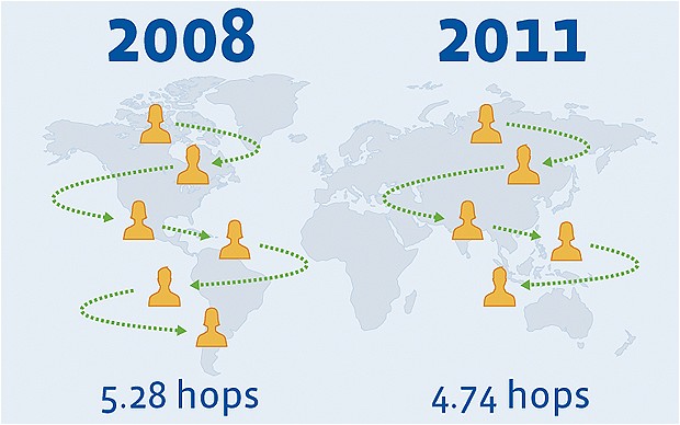 Lembra dos seis graus de separação em que bastariam seis apresentações sucessivas entre pessoas para que qualquer pessoa no mundo estivesse conectada a qualquer outra. Pois bem, passada a “dita globalização”, em tempos de redes sociais esse número vem caído fortemente e em recém pesquisa do Facebook com a Universidade de Milão esse número baixou de 6 para 5 e tendendo a 4 (Veja matéria completa no link acima do Telegraph).